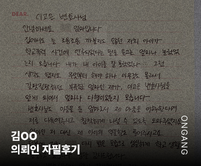 변호사님께서 수임료 받고 그냥 일을 하는 것이 아닌 아이의 미래까지 생각해주시는 모습에 이 감사함을 어떻게 표현해야 할지요.