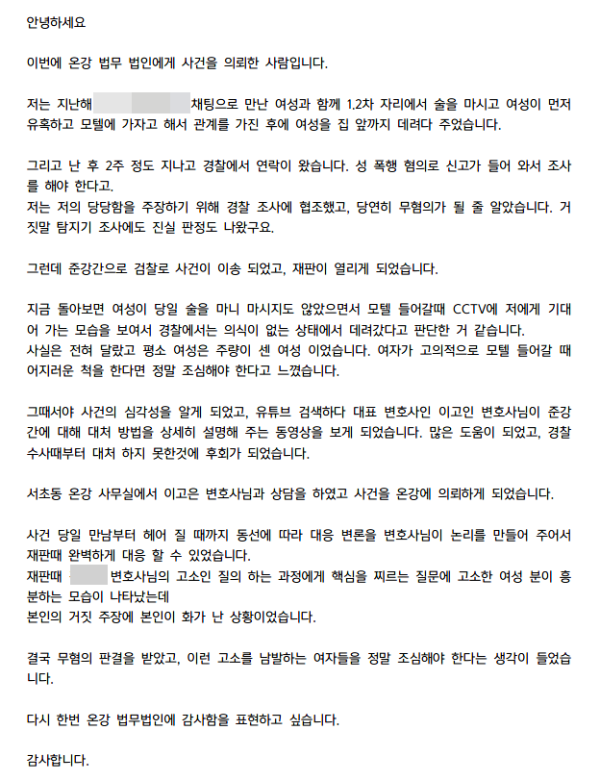 안녕하세요 이번에 온강 법무 법인에게 사건을 의뢰한 사람입니다. 저는 지난해 채팅으로 만난 여성과 함께 1.2차 자리에서 술을 마시고 여성이 먼저 유혹하고 모텔에 가자고 해서 관계를 가진 후에 여성을 집 앞까지 대려다 주었습니다. 그리고 난 후 2주 정도 지나고 경찰에서 연락이 왔습니다. 성 폭행 혐의로 신고가 들어 와서 조사를 해야 한다고. 저는 저의 당당함을 주장하기 위해 경찰 조사에 협조했고, 당연히 무혐의가 필 줄 알았습니다. 거짓 탐지기 조사에도 진실 판정도 나왔구모 그런데 준강간으로 검찰로 사건이 이송 되었고, 재판이 열리게 되었습니다.