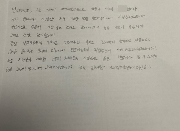 안녕하세요, 저는 이번에 재가처분없음으로 판결난 사건의 OOO입니다. 거의 반년이라는 시간동안 저의 억울한 면을 변호해주시느라 고생많으셨습니다. 변호사님들 덕분에 가장 좋은 결과로 끝나게 되어 정말 기분이 좋습니다. 그리고 정말 감사합니다. 정말 변호사님들의 일처럼 신경써주신 부분도 감사하게 생각하고 있습니다. 입시를 준비하는 학생의 입장에서 변호사님들의 직업정신이 매우 존경스러워졌습니다. 저도 지난날의 저처럼 곤경에 처해있는 사람들을 돕는 변호사가 될 수 있도록 더욱 감사히 생각하며 노력하겠습니다. 정말 감사하고 수고많으셨습니다.
