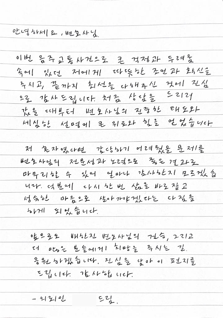 저 혼자였다면 감당하기 어려웠을 문제를 변호사님의 전문성과 노력으로 좋은 결과로 마무리할 수 있어 얼마나 감사한지 모르겠습니다.
