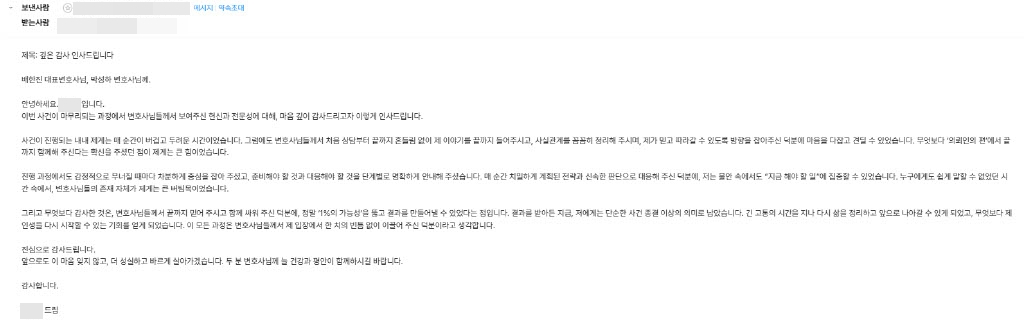 그리고 무엇보다 감사한 것은, 변호사님들께서 끝까지 믿어주시고 함께 싸워주신 덕분에, 정말 1% 가능성을 뚫고 결과를 만들어낼 수 있었다는 점입니다.