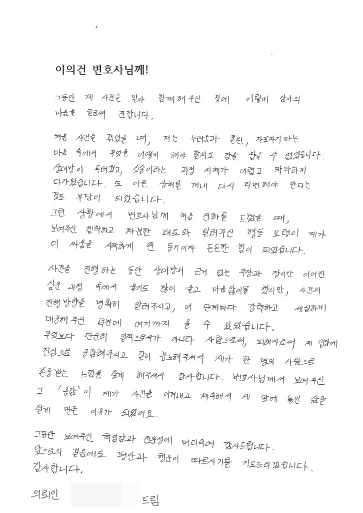 변호사님께서 보여주신 그 ‘공감’이 제가 사건을 이겨내고 계속해서 제 앞에 놓인 삶을 살게 만든 이유가 되었어요.