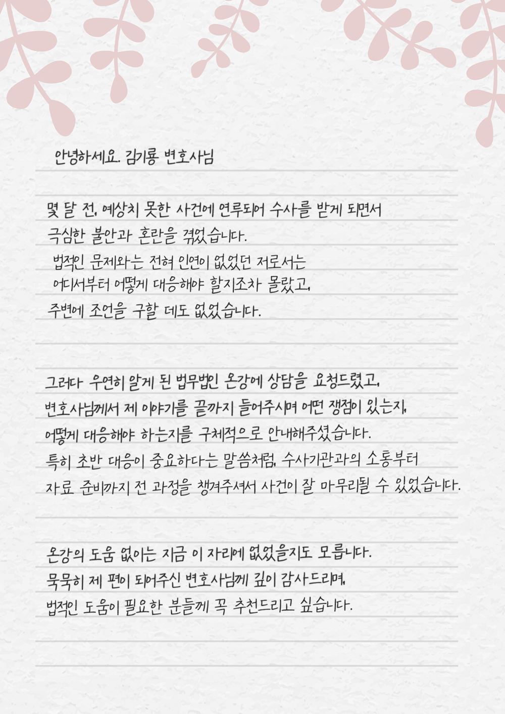 온강의 도움 없이는 지금 이 자리에 없었을지도 모릅니다. 묵묵히 제 편이 되어주신 변호사님께 깊이 감사드리며, 법적인 도움이 필요한 분들께 꼭 추천드리고 싶습니다.