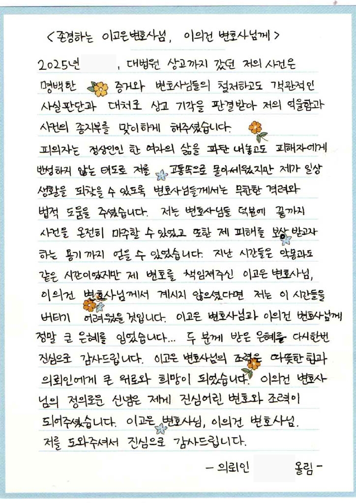 지난 시간들은 악몽과도 같은 시간이었지만 제 변호를 책임져주신 이고은 변호사님, 이의건 변호사님께서 계시지 않으셨다면 저는 이 시간들을 버티기 어려웠을 것입니다.