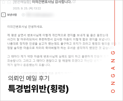 온강의 도움 없이는 지금 이 자리에 없었을지도 모릅니다. 묵묵히 제 편이 되어주신 변호사님께 깊이 감사드리며, 법적인 도움이 필요한 분들께 꼭 추천드리고 싶습니다. 2025년 9월 26일
